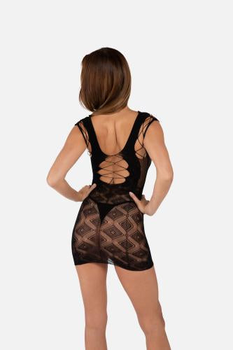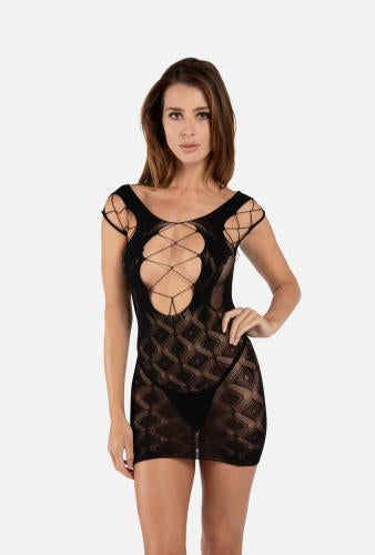 Feel sexy in this striking mini dress! The dress is close-fitting and has an open front and back with fishnet details for a challenging look. The stretchy material makes for a beautiful fit.